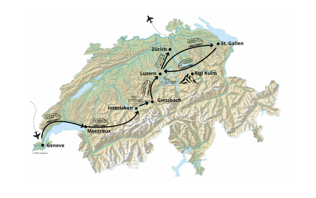 Bli med på en helt spesiell opplevelse der historie og vakre togreiser i fantastisk natur står i fokus. Vel fremme i Geneve går vi over på toget som frakter oss videre til Montreux. Vi nyter en god middag på hotellet, og gjør oss klare for et av turens høydepunkt dagen etter; Golden Pass Belle Epoque. Vi nyter 30-tallets luksus i disse nydelige historiske vognene, romantisk nostalgi og ikke minst utsikten på vei til Zweisimmen. Dette er virkelig en opplevelse utenom det vanlige! Her bytter vi over til det mer moderne panoramatoget, Golden Pass Express, som vi tar frem til Interlaken. Her venter en nydelig båttur over Brienzersjøen direkte til hotellets brygge og den historiske kabelbanen som fører opp til hotellet ovenfor.  Vi skal nå tilbringe to netter blant historie og eleganse, og ikke minst fantastisk utsikt og mat på femstjerners hotellet Grandhotel Giessbach med historie tilbake til 1873. Vi får en dag til egen disposisjon der de som ønsker kan bli med til Ballenberg Museum i Brienz, eller man kan nyte de usedvanlig vakre omgivelsene rundt hotellet. Turen fortsetter så med panoramatoget Luzern-Interlaken Express til Luzern. Herfra drar vi så videre med vårt private, historiske tannstangtog til Rigi Kulm som ligger ca. 1800 m.o.h. Her finner man en helt fantastisk panoramautsikt over de nærliggende alpene, Luzern-innsjøen og Mittelland (Det sveitsiske mellomlandet). Vi nyter utsikten og har litt tid før vi reiser videre med toget og får en deilig båttur over Luzern-innsjøen. De siste to dager tilbringer vi i vakre Luzern der vi reiser med Voralpen Express til den gamle byen St. Gallen. Her får vi guidet tur i historiske omgivelser og nyter synet blant annet av benediktinerklosteret grunnlagt i 747 og dets vakre bibliotek. Vi samles siste kvelden i Luzern for tradisjonelt avskjedsmiddag. Denne turen er virkelig proppfull av opplevelser for livet!